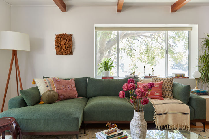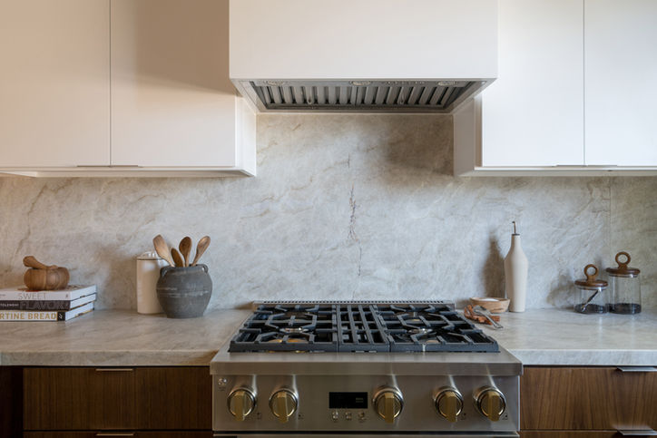Working within the same footprint for the entire first floor, we rearranged the bathroom to create a larger shower as a focal point with clean lines and bold tile colors. In the kitchen we added storage in the form of new two-tone white and stained walnut cabinetry, a custom hood and pantry, and earthy Taj Mahal quartzite countertops and backsplash for a hint of wabi-sabi. In the living and dining areas, we combined the owners' collection of vintage art and furnishings with new pieces and a fresh earthy color palette to create a unique and eclectic mix. The result is a warm and inviting home that honors both our clients' culture, and their modern way of living.
