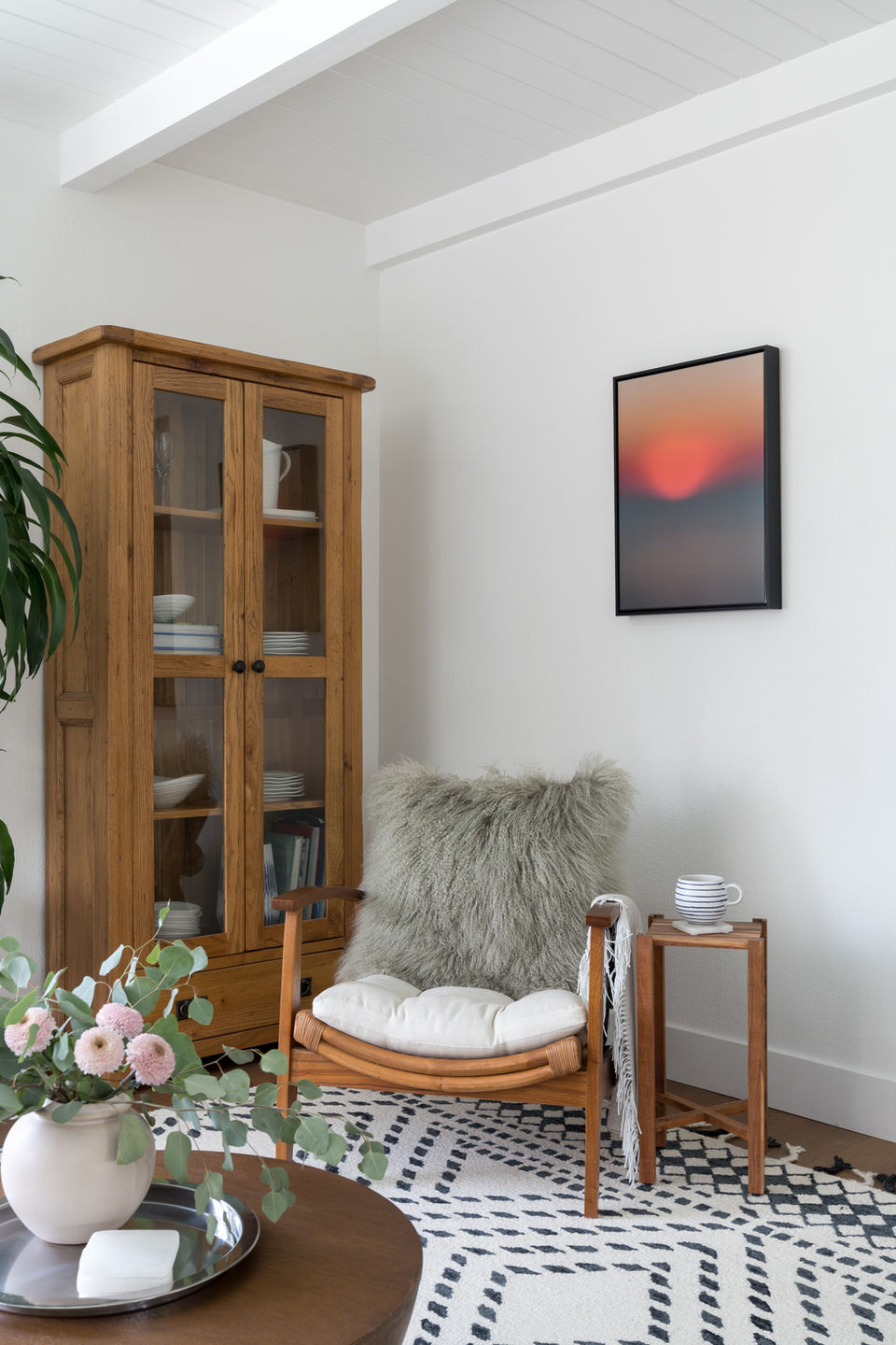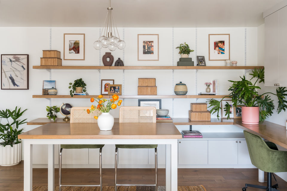 These clients loved the midcentury bones of their home and wanted the design to stay as true to that aesthetic as possible, while updating it for modern living. They opted to keep the original brick fireplace as a focal point, so we added a new mantel and freshened it with a coat of paint to provide a jumping off point for the design. We reconfigured and united the kitchen and dining room by demolishing a wall and created a huge peninsula for prep space. Two-tone walnut and navy cabinetry and sleek hardware finish off the sophisticated but approachable design, and the adjacent dining space now features a custom drinks area and open sight lines to the living room. Since the house already featured a den, we opted to transform the formal living room into a work-play area for the whole family by adding a full wall of built-ins and two desk areas that overlook a dedicated play area for the kids.