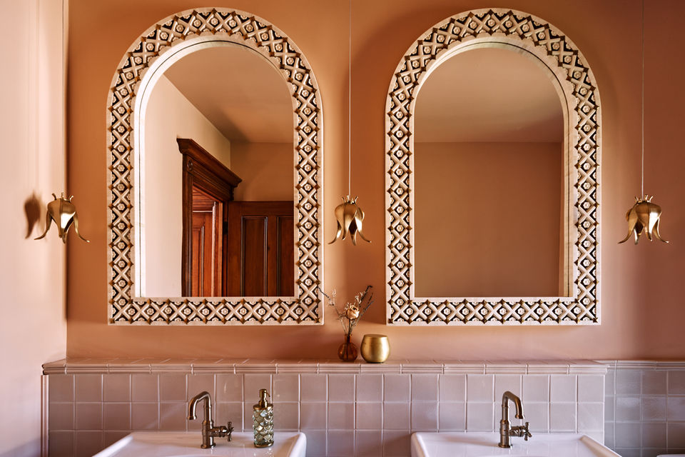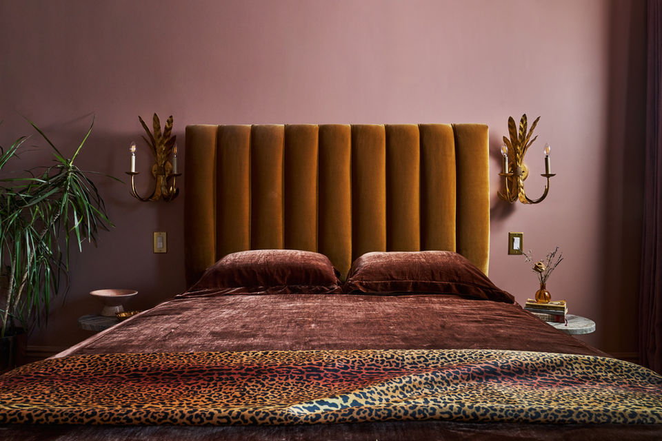 For our guest bedroom and bath in the 2024 Real Simple Home, we channeled Barbra Streisand in the 1969 movie "Funny Girl." Much like the movie sets and costumes in Funny Girl, the goal was for our spaces to feel opulent, a little art deco, and eclectic. In the bedroom, we opted for a mauve-painted backdrop, crushed velvet bedding in chocolate brown, and deep purple curtains. The effect is a soothing and polished backdrop for pops of flora (the lotus light and dried floral arrangement) and fauna (the tiger pillow and snake table). We brought similar pink, purple, rust, and tan hues to the adjoining bathroom to make the two spaces feel cohesive. Using 5 different colors of Fireclay tile, we created our own mosaic, and the sculptural arch in front of the tub, with its hand-painted cranberry trim, adds a little drama to the space.